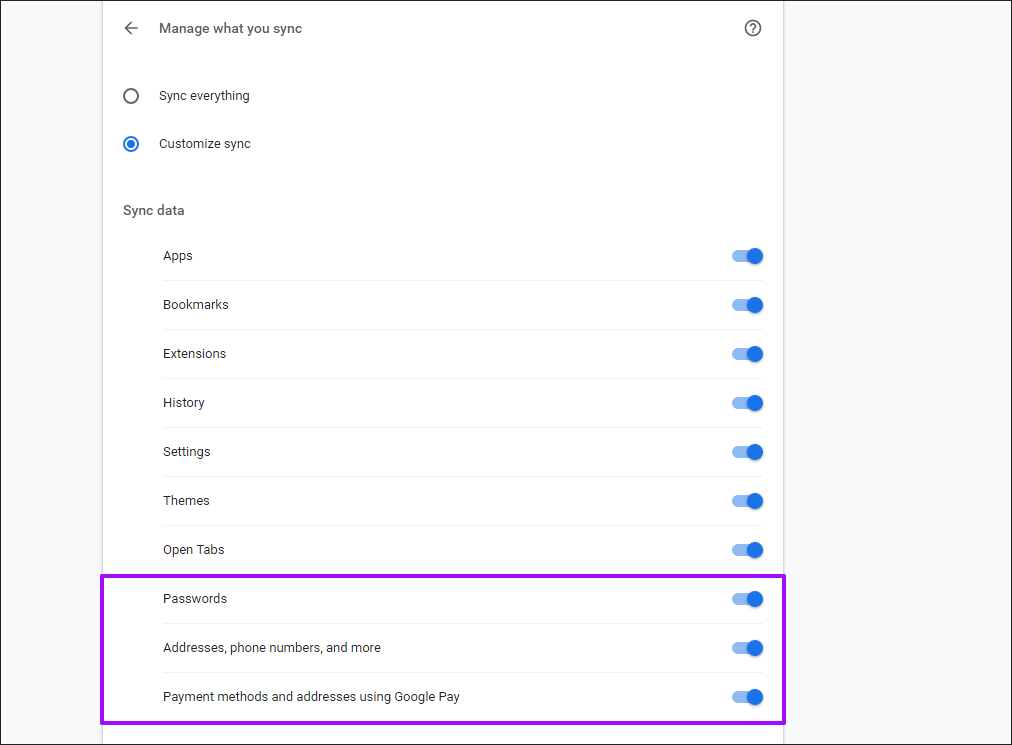 Убедитесь, что переключатели рядом с «Паролями», «Адреса, номера телефонов и т. Д.» И «Способы оплаты и адреса с помощью Google Pay» включены.