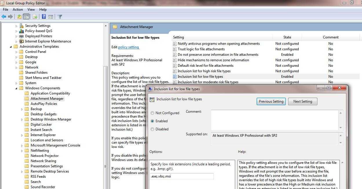 С помощью политики «Список исключений для типов файлов с низким риском», после ее включения, можно указать в настройках список расширений файлов (например, .exe, .bat), при запуске которых окно с предупреждением выводиться не будет.