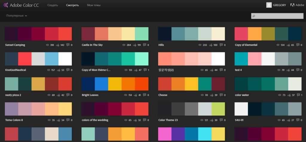 Тут вы сможете подобрать цветовую палитру на основе изображения, а также во вкладке «Explore» (Смотреть) увидеть решения других пользователей и даже узнать количество просмотров и лайков ![]()