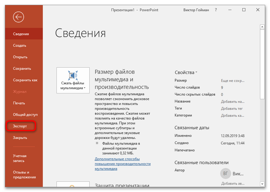 - Откройте презентацию, которую нужно конвертировать в формат DOCX. Для примера опять воспользуемся стандартным шаблоном PowerPoint, демонстрирующим возможности программы.
