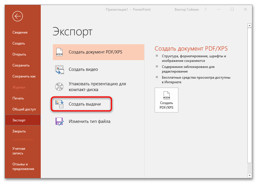Экспорт — сохранение документа в формате PDF, XPS и других форматах.