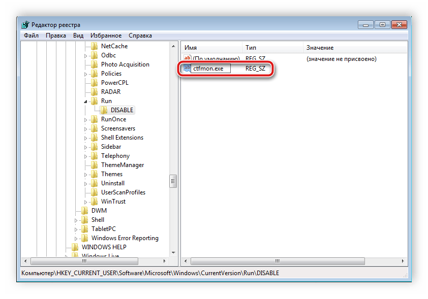 - в строку Значение вписываем “ctfmon”=”CTFMON.EXE”;