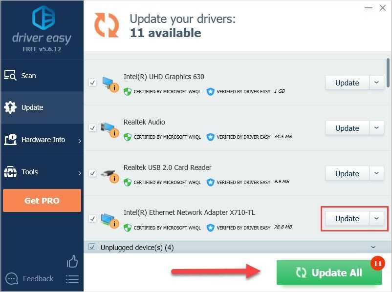 3) Щелкните значок Обновить рядом с отмеченным драйвером, чтобы автоматически загрузить правильную версию этого драйвера, затем вы можете установить ее вручную (вы можете сделать это в БЕСПЛАТНОЙ версии). Или нажмите Обновить все для автоматической загрузки и установки правильной версии все драйверы, которые отсутствуют или устарели в вашей системе. (Для этого требуется Pro версия который поставляется с полной поддержкой и 30-дневной гарантией возврата денег. Вам будет предложено выполнить обновление, когда вы нажмете «Обновить все».)