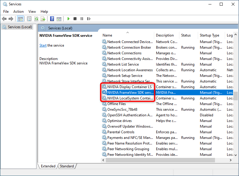 - Найдите все службы, в которых упоминается Nvidia, в окне «Службы».