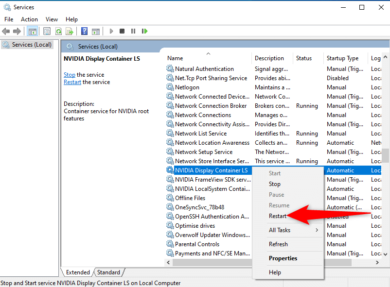 - Щелкните правой кнопкой мыши одну из этих служб Nvidia и выберите в меню пункт «Перезагрузить». Повторите этот процесс для каждой службы Nvidia.