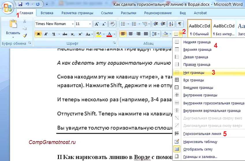 Кстати, на рис. 3 видно, что есть способ проще. Можно поставить курсор в начало строки в Word и кликнуть «Горизонтальная линия» (5 на рис. 4):