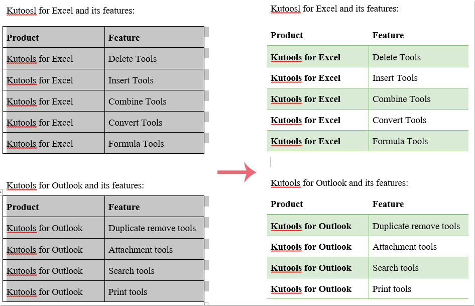 Измените стиль всех таблиц с помощью Kutool for Word