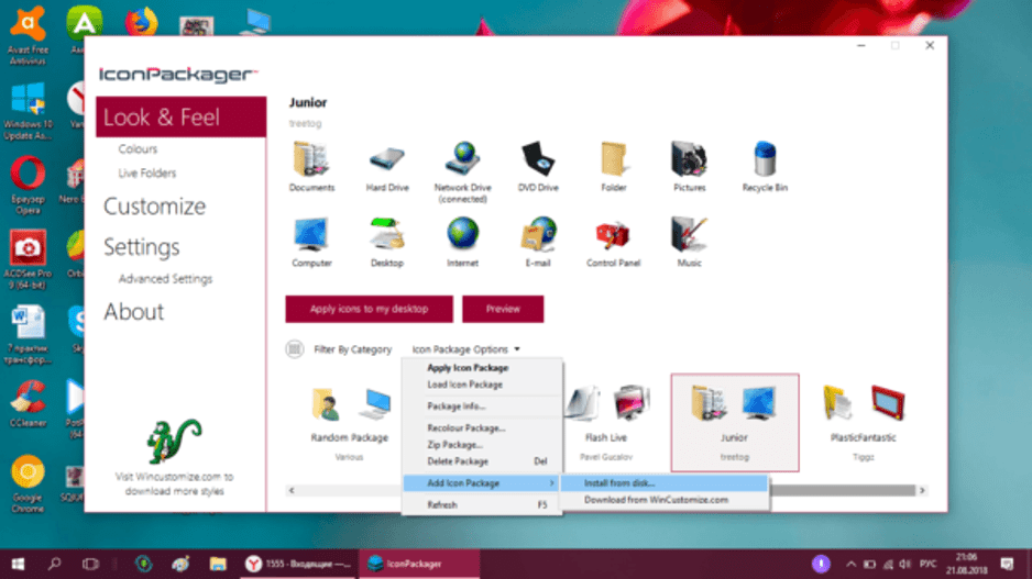 Через Проводник останется найти файл с темами иконок, нажать «Открыть». В меню отобразится новая добавленная коллекция. Особенность IconPackager заключается в том, что софт бесплатный только 30 дней, далее придется оплачивать подписку.