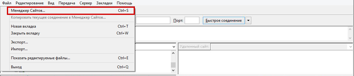 Установка стандартная, все время жмем далее и выбираем куда поставить FileZilla Client. Открываем программу, нажимаем Файл > Менеджер сайтов.