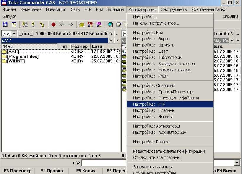 1. Запустите программу TotalCommander, после чего, в верхнем меню нажмите пункт Конфигурация и выберите строку Настройка: FTP