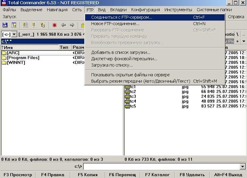 3. В верхнем меню нажмите пункт FTP и выберите строку Соединиться с FTP-сервером.