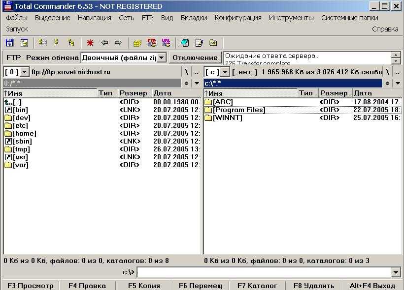 7. Произойдет соединение с сервером и можно работать в привычном режиме двухпанельного файлового менеджера.