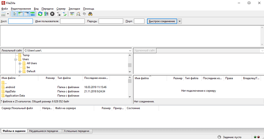 Его главное окно поделено на несколько рабочих областей. Слева расположены каталоги и файлы на ПК пользователя, а справа – каталоги и файлы на сервере.