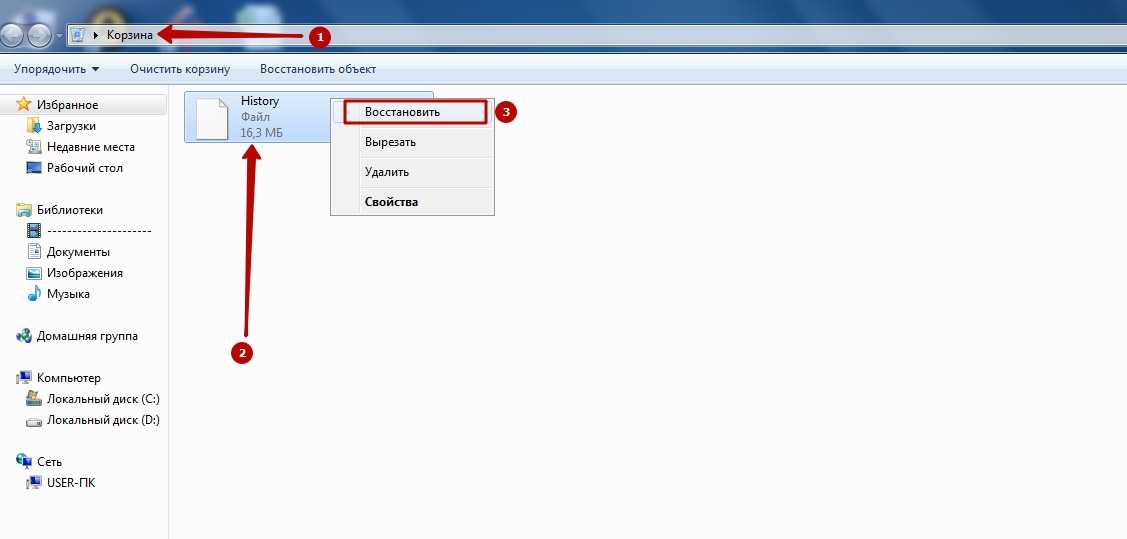 Если Вы удалили из системной папки «Default» файл history правой кнопкой мыши или нажатием клавиши Delete, его без труда можно «возродить». Все, что надо – зайти в «Корзину», найти там искомый документ, кликнуть по нему ПКМ и выбрать «Восстановить». Файл с историей снова будет находиться в прежней папке.