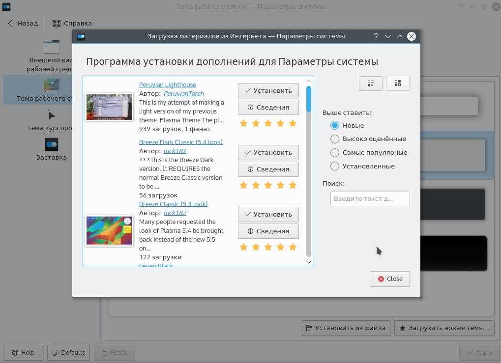 В каталоге тем KDE есть темы на любой вкус, здесь есть функция поиска, а также сортировка по новизне, популярности, рейтингу и количеству загрузок.