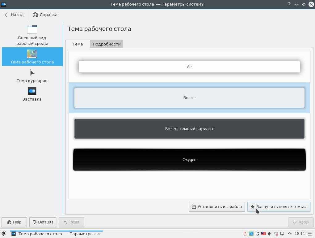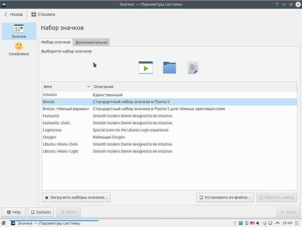 А раздел Значки позволяет выбрать тему значков для приложений, можно оставить новый, современный набор значков Breeze или, например, вернуть старый набор Oxygen также можно скачать дополнительные наборы значков из интернета: