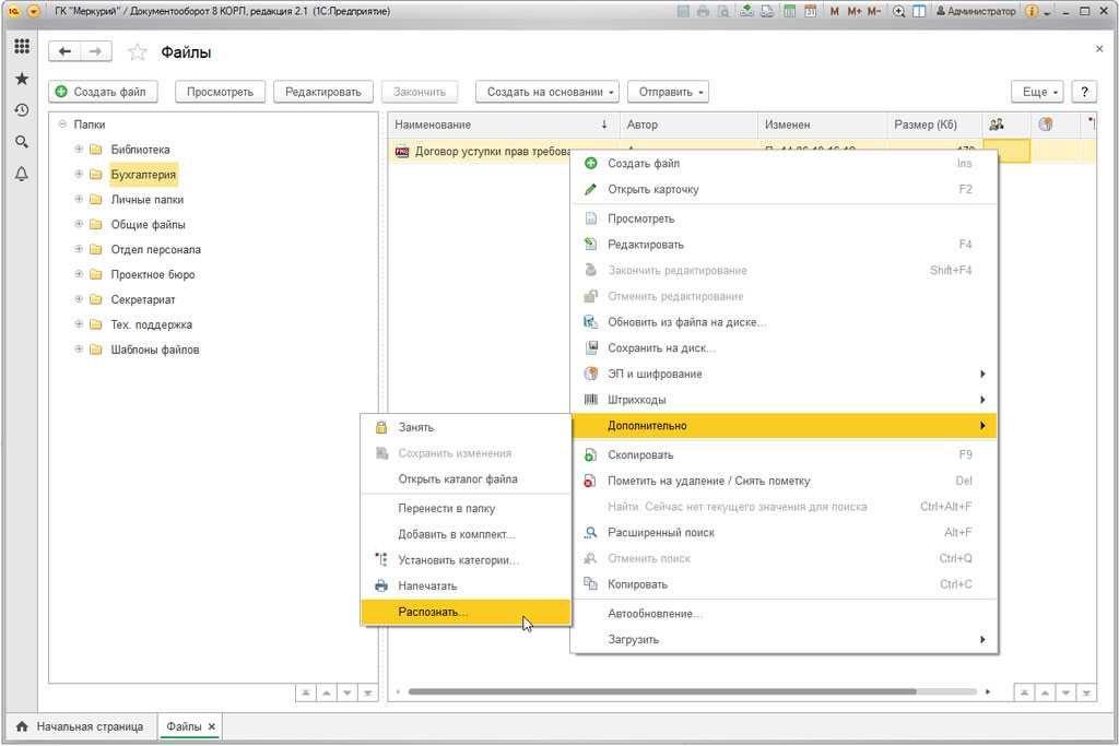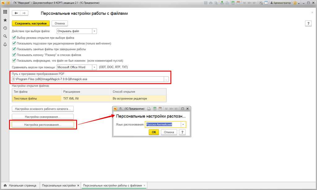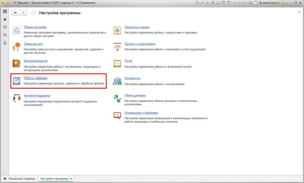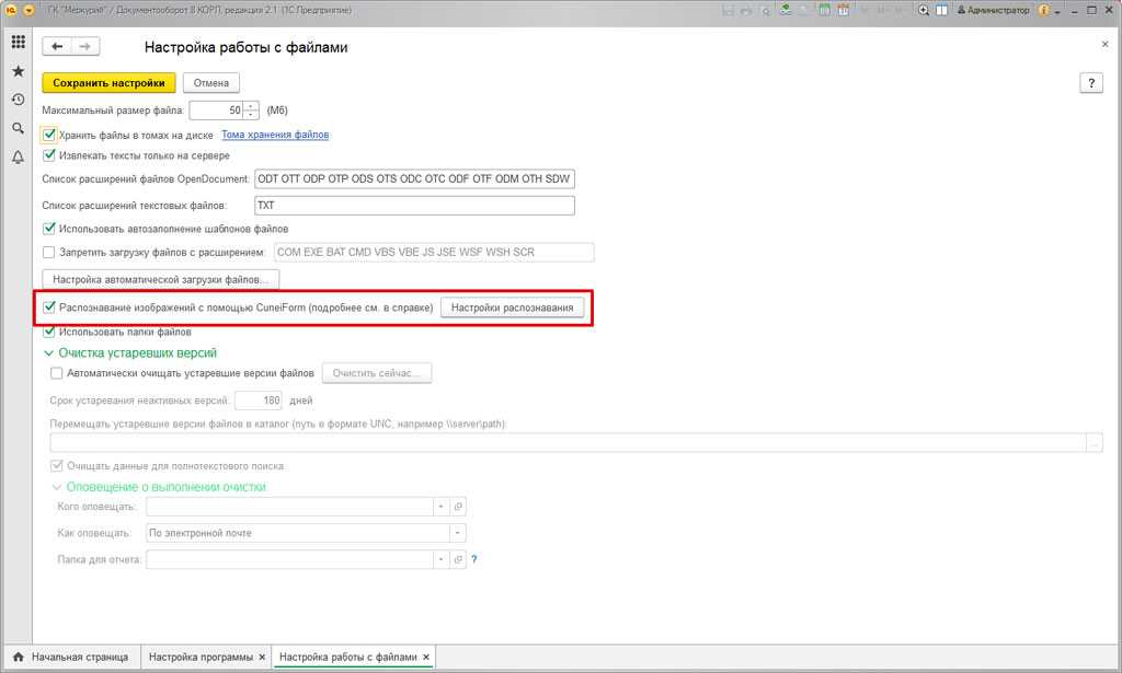 Чтобы распознавать документы в 1С:Документооборот, надо зайти в меню «Настройка и администрирование», перейти в раздел «Настройка программы» и выбрать пункт «Работа с файлами».