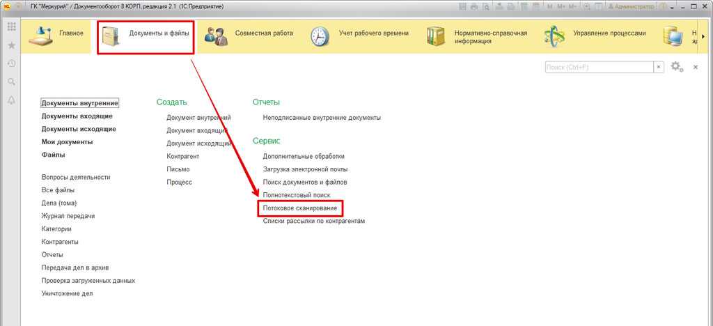 Когда надо сканировать много документов, лучше воспользоваться подсистемой потокового сканирования. Чтобы перейти к этой функции, надо зайти в раздел «документы и файлы» и выбрать вариант «Потоковое сканирование».