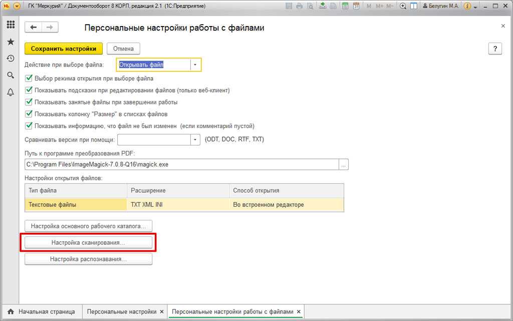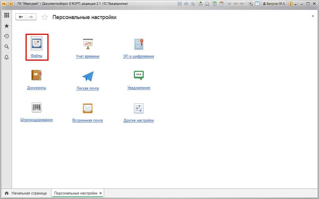 Для использования сканера прямо из 1С:Документооборот требуется установка специальной утилиты сканирования и настройка подключенного локального сканера. Это делается в разделе «Настройка», где надо выбрать пункт «Персональные настройки» и открыть меню «Файлы».