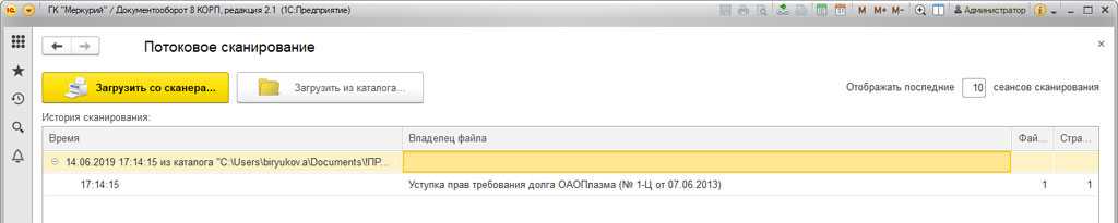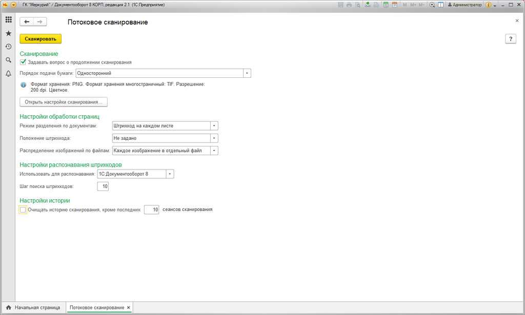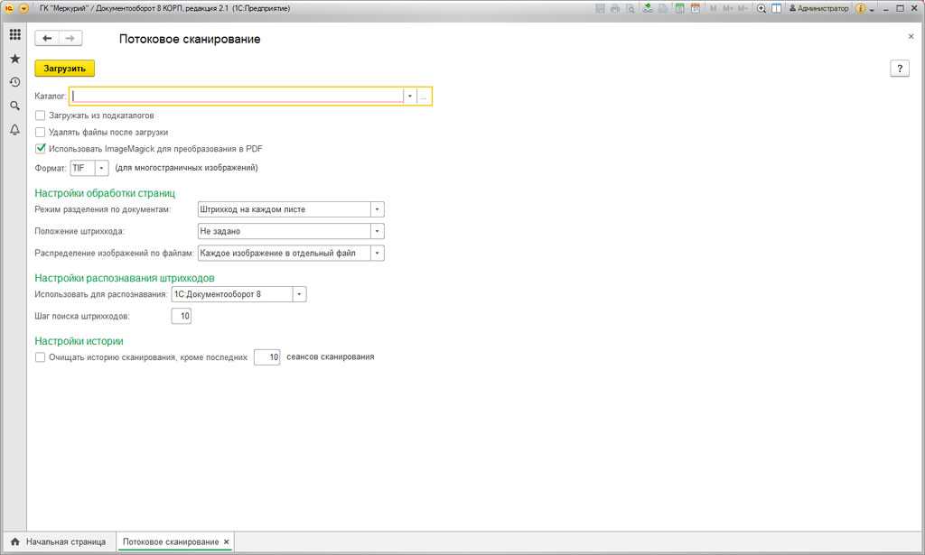 Чтобы загрузить документ непосредственно со сканера, надо установить нужные параметры. Можно настроить обработку страниц, распределение изображений по файлам, распознавание штриховых кодов, историю.