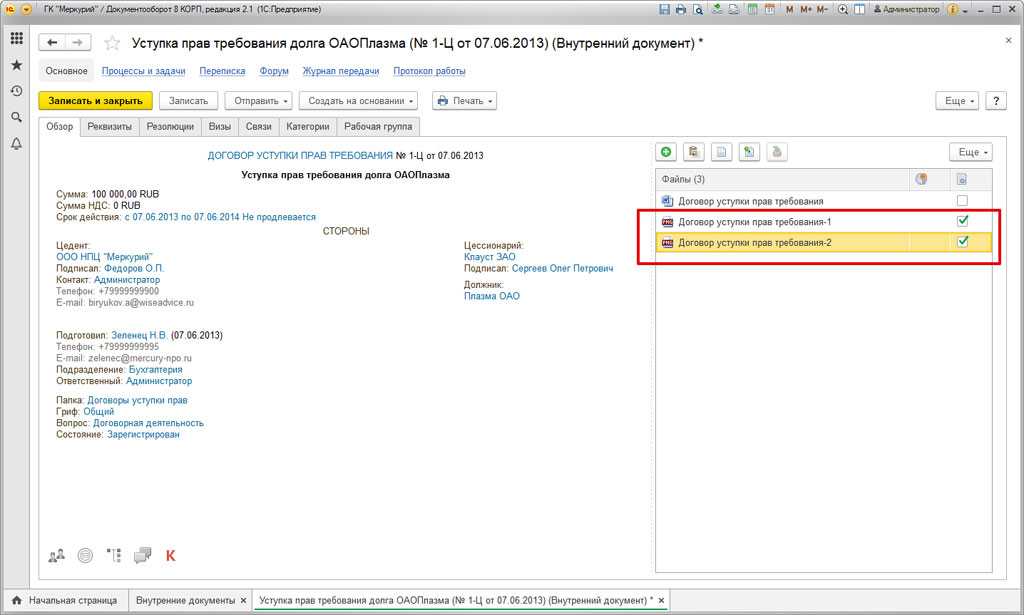 В данном примере отсканированные файлы система прикрепила к карточке договора.
