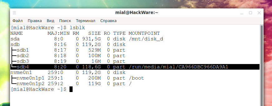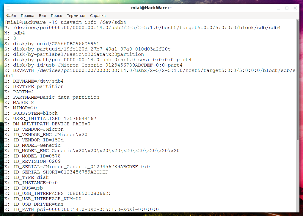Исходя из вывода предыдущей команды, USB-диск называется sdb4 (абсолютный путь должен быть /dev/sdb4). Чтобы запросить атрибуты устройства из базы данных udev, используйте команду info.