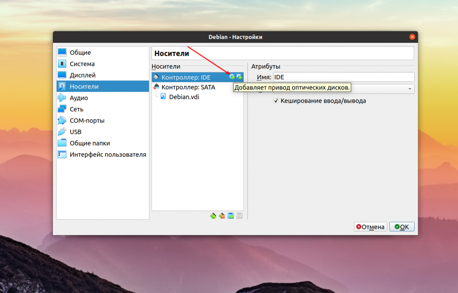 Здесь есть раздел Контроллер IDE, кликните по значку рядом с ним Добавить привод оптических дисков: