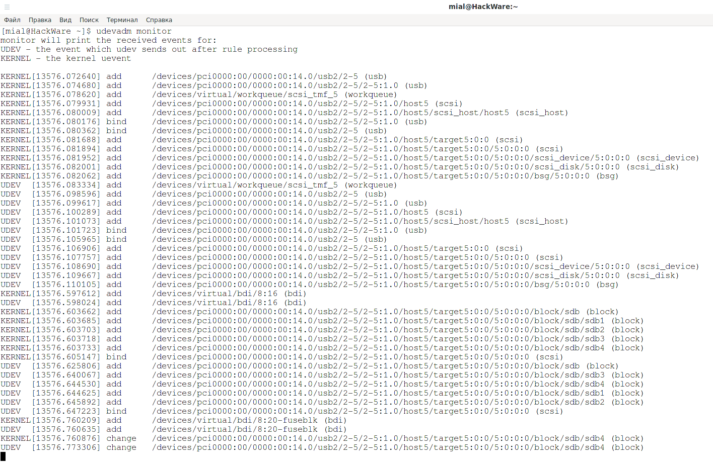 Чтобы отобразить полученные события ядра (uevents) и события udev (которые udev отправляет после обработки правила), запустите udevadm с командой monitor. Затем подключите устройство к вашей системе и наблюдайте с терминала, как обрабатывается событие устройства.