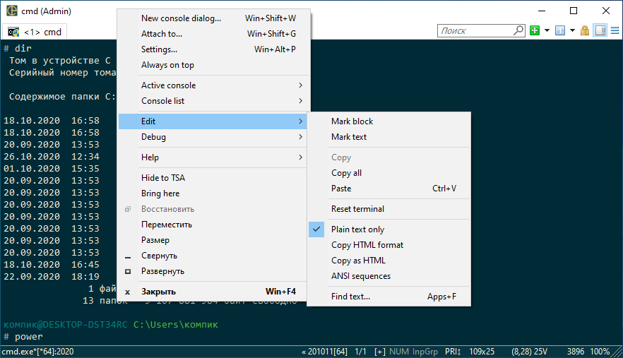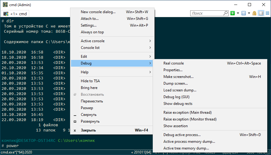 Из особенностей ConEmu следует отметить также, что по умолчанию программа всегда запускается с правами администратора. В программе можно выбрать русский язык, но часть элементов меню при этом так и останется на английском, что является ее основным недостатком.
