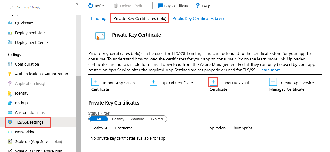 В левой области навигации приложения выберите Параметры TLS/SSL > Сертификаты закрытых ключей (PFX) > Импорт сертификата Key Vault.