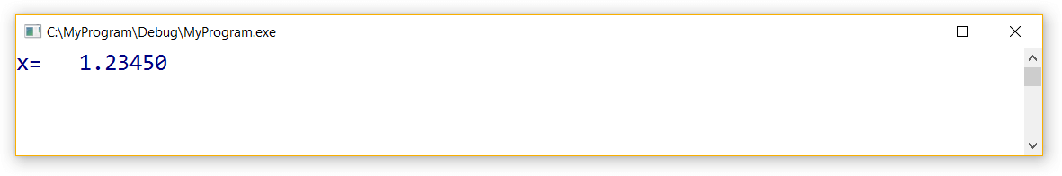 #include <stdio.h>int main(){ float x = 1.2345; printf(«x=%10.5f\n», x); getchar(); return 0;}