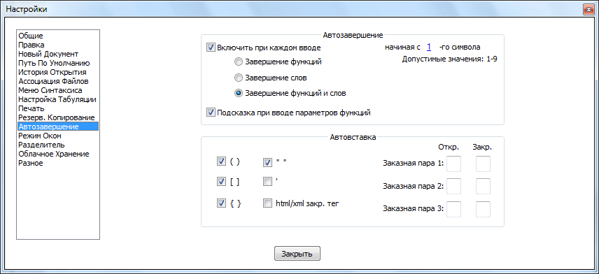 Очень полезная функция расположена в разделе «Автозавершение». Здесь можно включить автовставку знаков (кавычки, скобки, и т.д.) и тегов. Таким образом, даже если вы забудете закрыть какой-то знак, программа сделает это за вас.