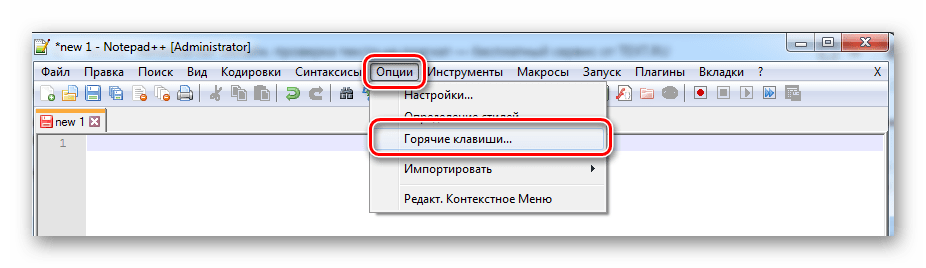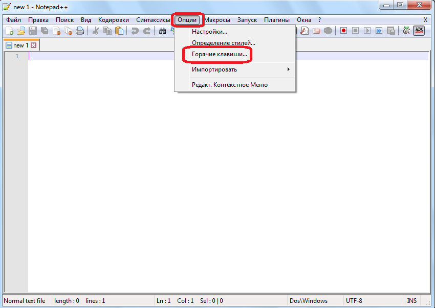 Помимо этого набора настроек, в Notepad++ можно изменить кнопки быстрого доступа. Для этого необходимо щелкнуть по кнопке «Опции» в верхнем меню и выбрать «Горячие клавиши».