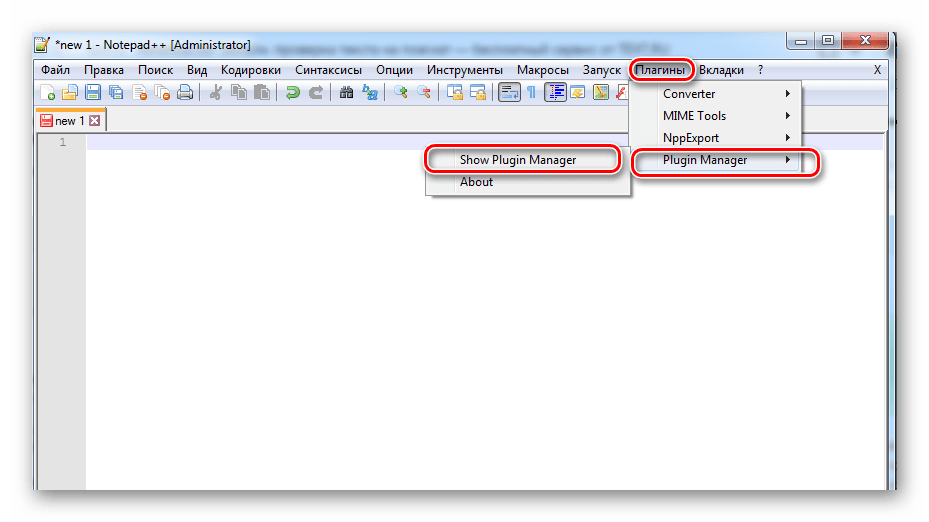 - Откройте приложение Notepad ++ и используйте ленточное меню вверху, чтобы нажать «Плагины», затем нажмите «Администрирование плагинов» в только что появившемся контекстном меню.Доступ к меню плагинов в Notepad ++