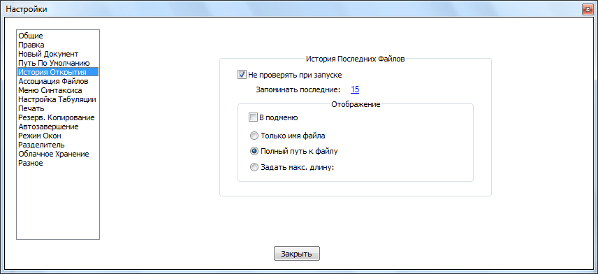 Во вкладке «История открытия» указывается количество последних открытых файлов, которые программа будет запоминать. Данное значение можно оставить по умолчанию.