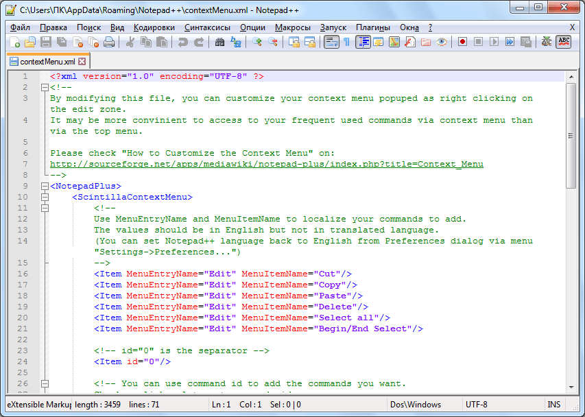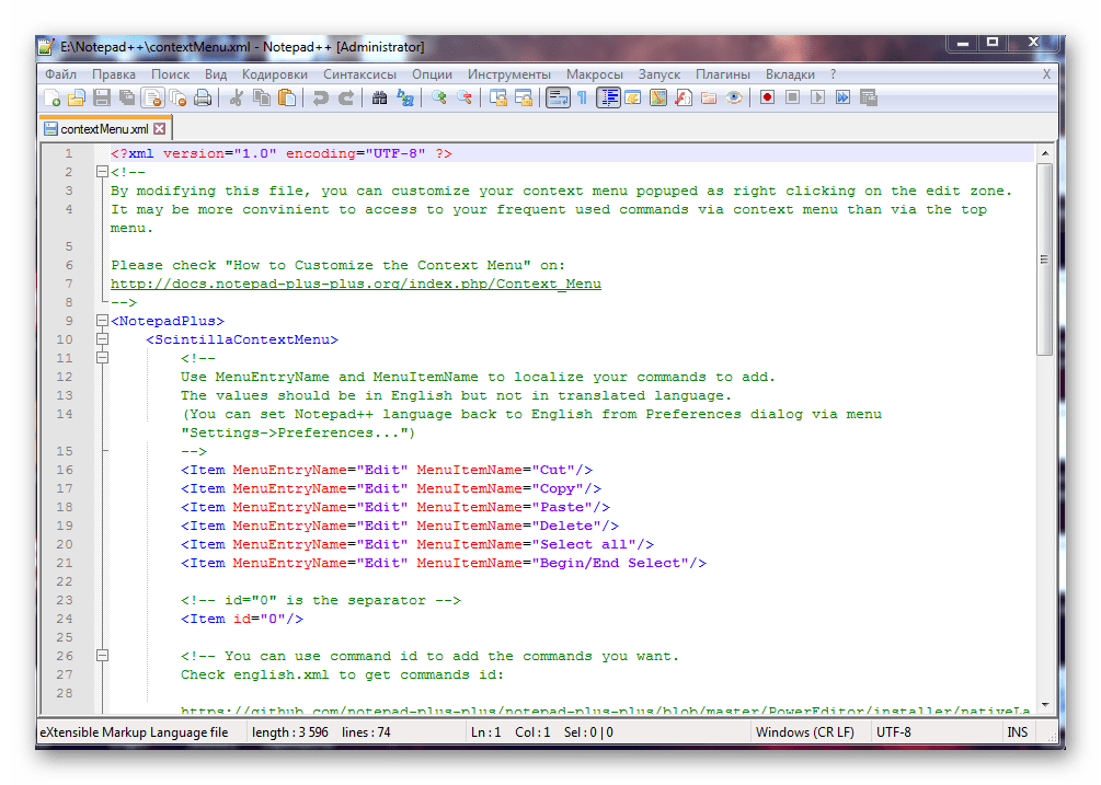 После клика по нему в текстовом редакторе открывается файл, отвечающий за содержимое контекстного меню. Его тут же можно редактировать, воспользовавшись языком разметки.