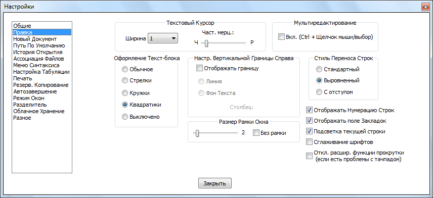В разделе «Правка» имеется возможность настройки курсора под себя. Тут же включается подсветка и нумерация строк. По умолчанию они включены, но при желании их можно отключить.