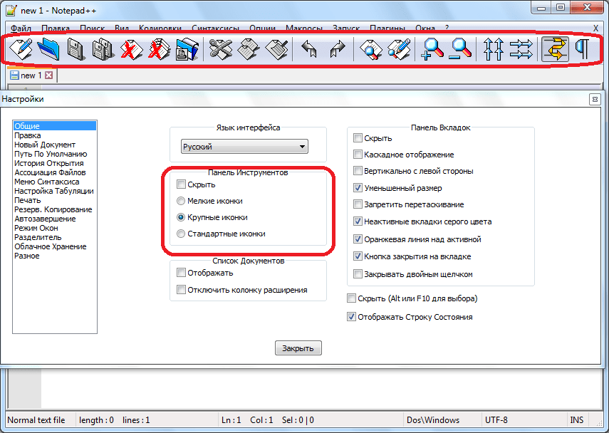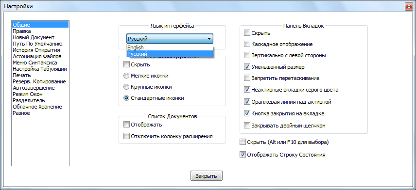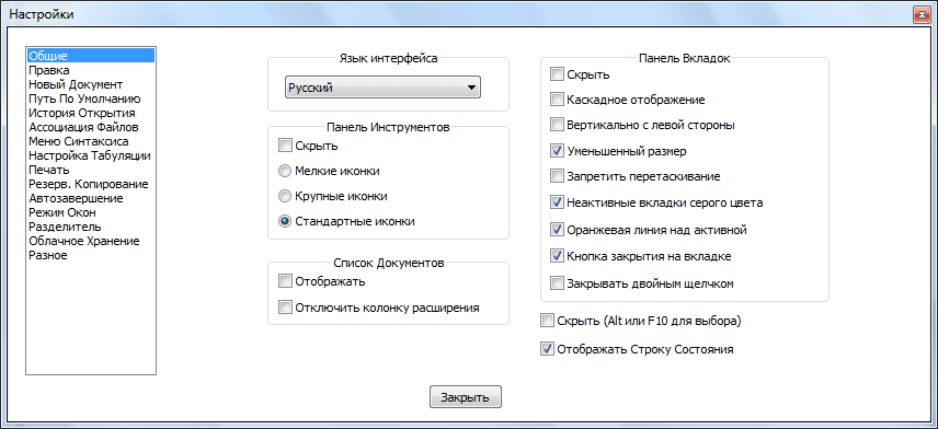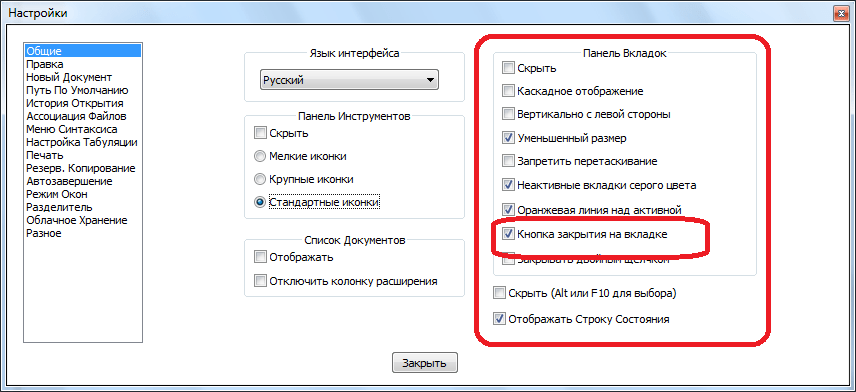 Тут же настраивается отображение вкладок и строки состояния. Панель вкладок скрывать не советуем. Для большего удобства пользования программой желательно, чтобы пункт «Кнопка закрытия на вкладке» был помечен галочкой.