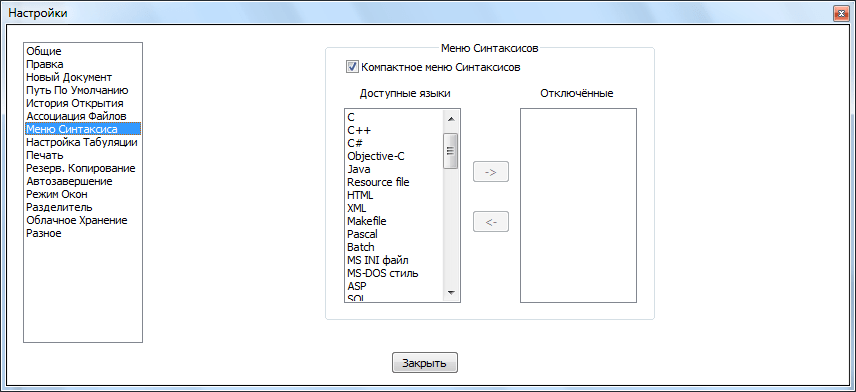 В «Меню синтаксиса» можно отключать языки программирования, которыми вы не пользуетесь.