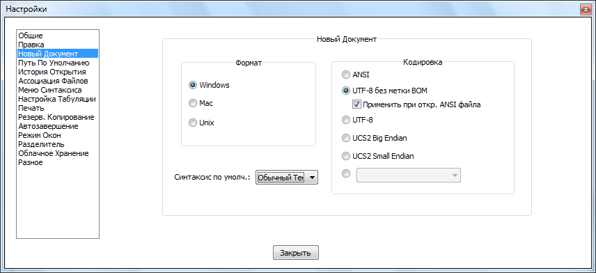 Во вкладке «Новый документ» выбираем формат и кодировку по умолчанию. Формат настраиваем по названию своей операционной системы.