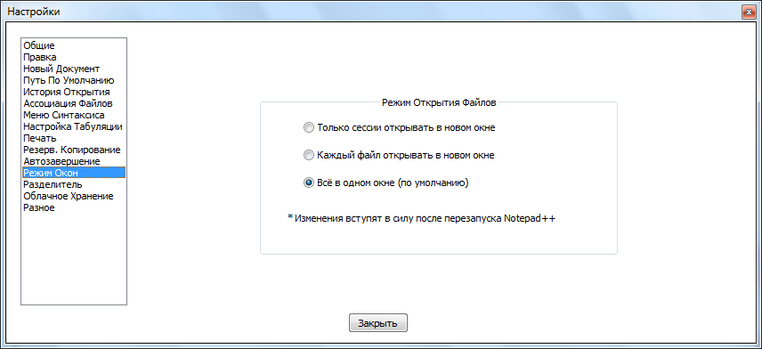 Во вкладке «Режим окон» можно установить открытие каждой сессии в новом окне, и каждого нового файла. По умолчанию все открывается в одном окне.