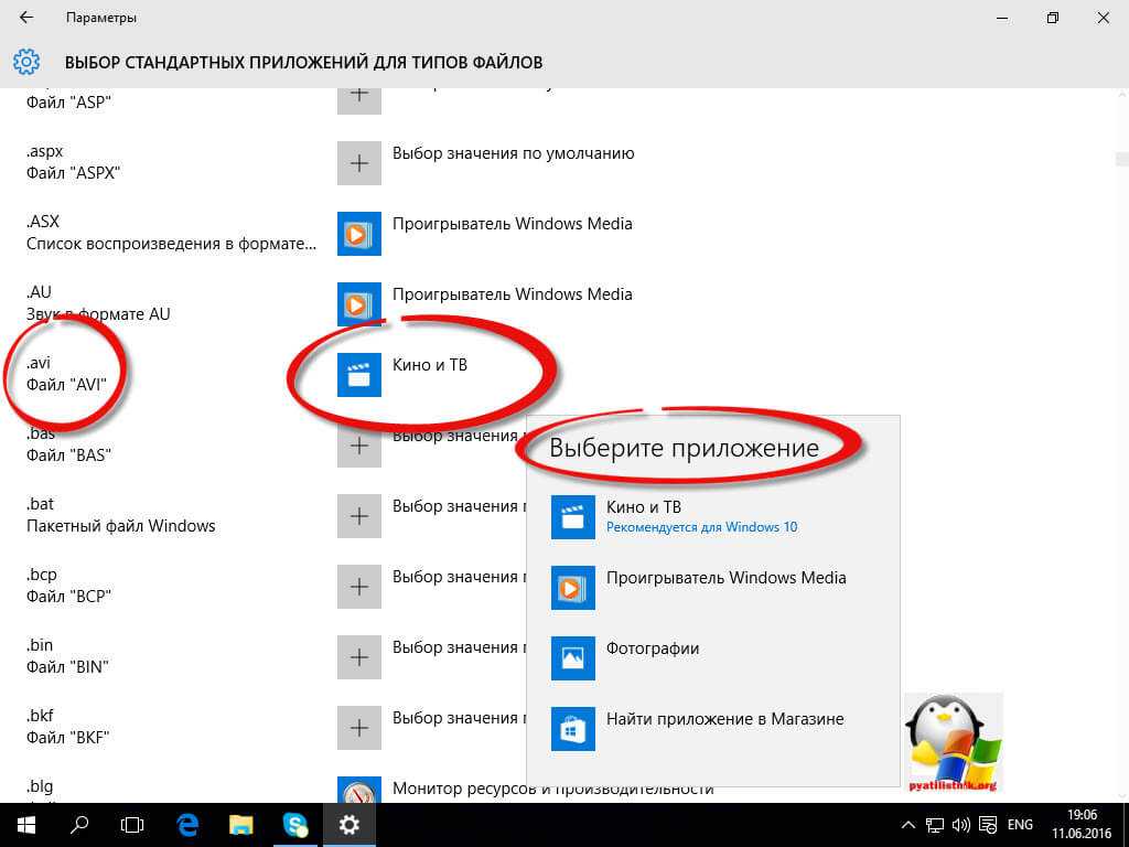 Давайте разбираться, что за что отвечает. Первое, что мы нажмем, это Выбор стандартных приложений для типов файлов. У вас открывается полный список всех форматов, для примера я выбрал формат .avi это видео файлы, по умолчанию он открывается приложением Кино и Тв, щелкаю по нему и у вас открылся более расширенный список доступных приложений, если чего то нет, то нажимаем Найти приложение в Магазине, это ручное соотнесение ассоциации файлов в Windows 10.