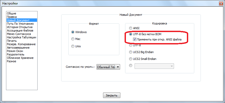 Кодировку для русского языка лучше всего выбрать «UTF-8 без метки BOM». Впрочем, эта настройка должна стоять по умолчанию. Если стоит другое значение, то измените его. А вот галочку около записи «Применить при открытии ANSI файла», которая установлена в начальных настройках, лучше снять. В обратном случае, все открытые документы будут автоматически перекодироваться, даже если вам этого не нужно.