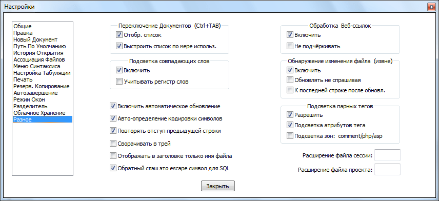 Во вкладке «Разное» производится настройка таких параметров, как переключение документов, подсветка совпадающих слов и парных тегов, обработка ссылок, обнаружение изменение файлов через другое приложение. Тут же можно отключить активированные по умолчанию автоматическое обновление, и автоопределение кодировки символов. Если вы хотите, чтобы программа сворачивалась не на Панель задач, а в трей, то нужно поставить галочку около соответствующего пункта.