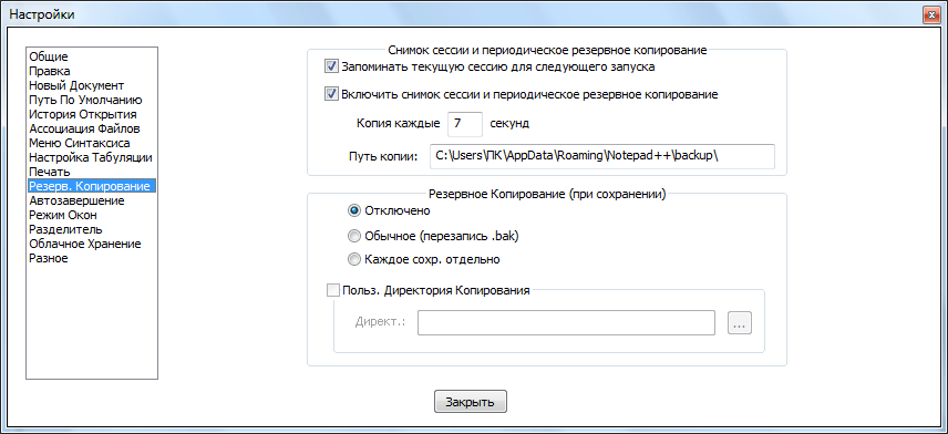 В разделе «Резервное копирование» можно включить снимок сессии (по умолчанию активировано), который периодически будет перезаписывать текущие данные, во избежание их потери в случае сбоев. Тут же настраивается путь к директории, куда снимок будет сохраняться, и периодичность сохранения. Кроме того, можно включить резервное копирование при сохранении (по умолчанию отключено), указав нужную директорию. В этом случае, каждый раз при сохранении файла будет создаваться резервная копия.