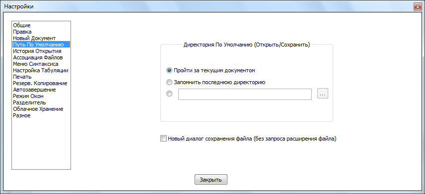 В разделе «Путь по умолчанию» указывается, куда программа будет предлагать сохранить документ в первую очередь. Здесь можно указать либо конкретную директорию, либо оставить настройки как есть. В таком случае, Notepad++ будет предлагать сохранить обработанный файл в той директории, которая последней открывалась.