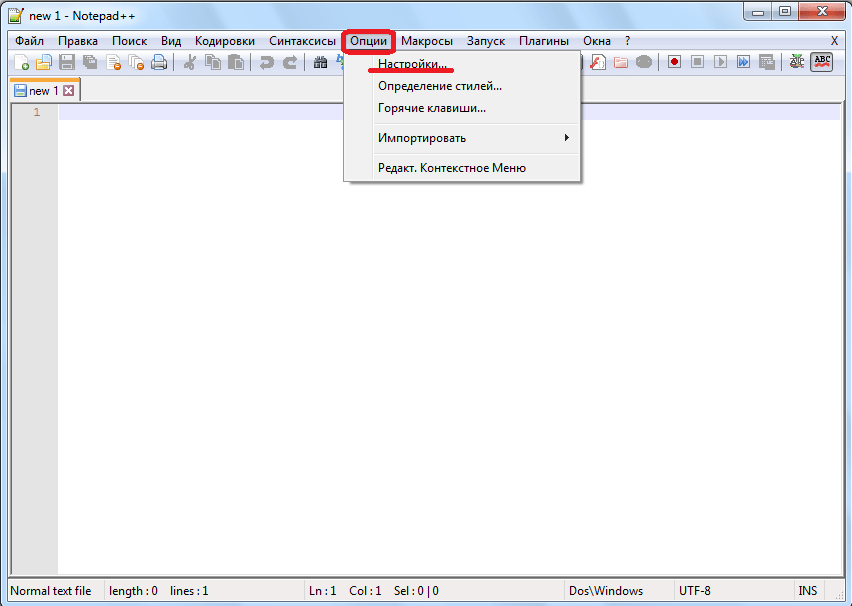Чтобы попасть в раздел основных настроек программы Notepad++, кликаем по пункту «Опции» горизонтального меню, а в появившемся выпадающем списке переходим по записи «Настройки…».