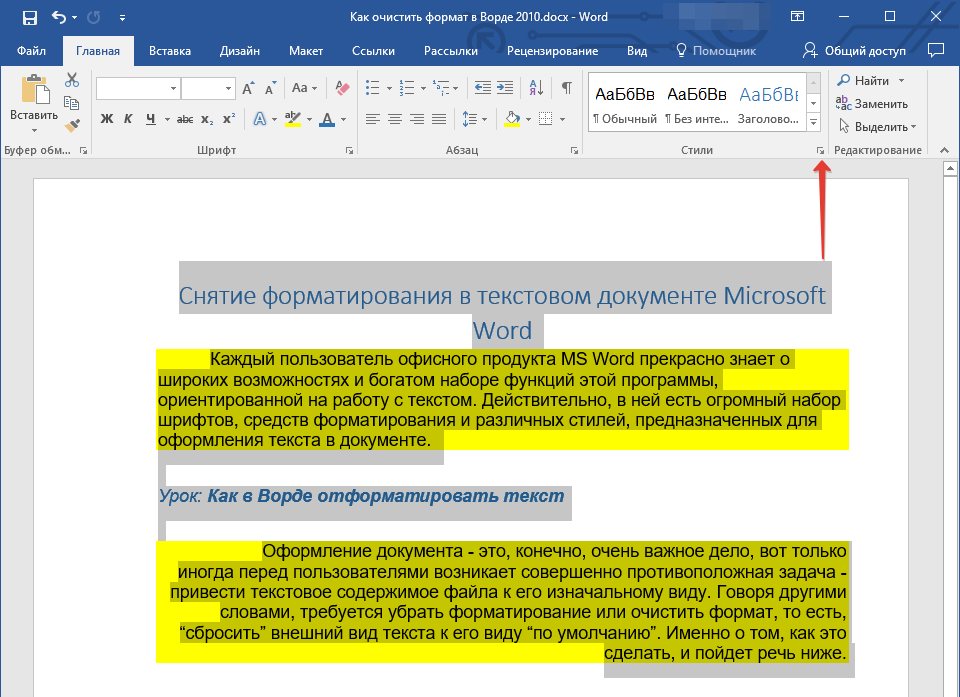 Выделим его содержимое (нажать CTRL+A на клавиатуре), и обратим внимание на вкладку “Главная”. В группе “Стили” присмотритесь к нижнему правому углу и увидите небольшой значок в виде обращенной вправо-вниз стрелки