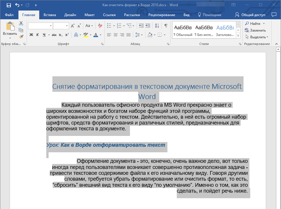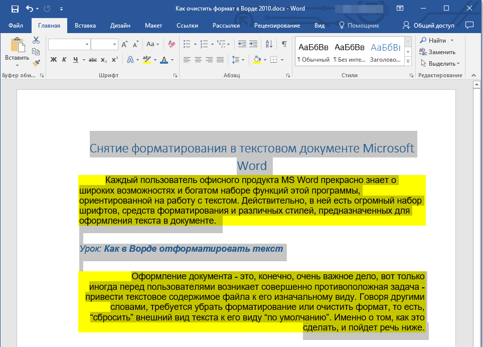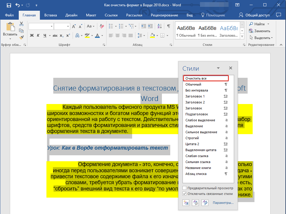 После этого форматирование с текста будет снято, то есть вы добьетесь желаемого результата. Как видно, в отличие от программы 2003 года, в остальных версиях это действие выполняется намного проще.