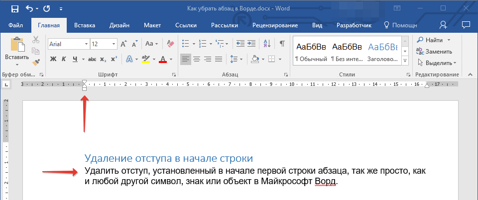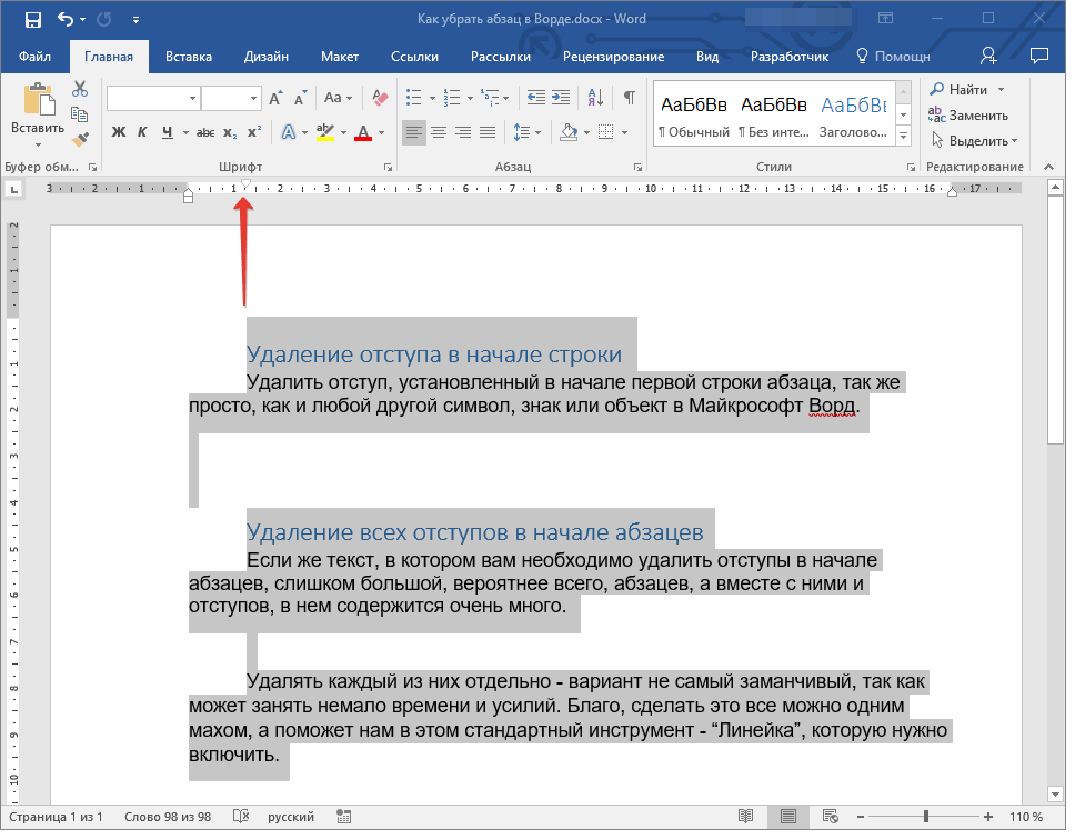 Удалить отступ, установленный в начале первой строки абзаца, так же просто, как и любой другой символ, знак или объект в Microsoft Word.